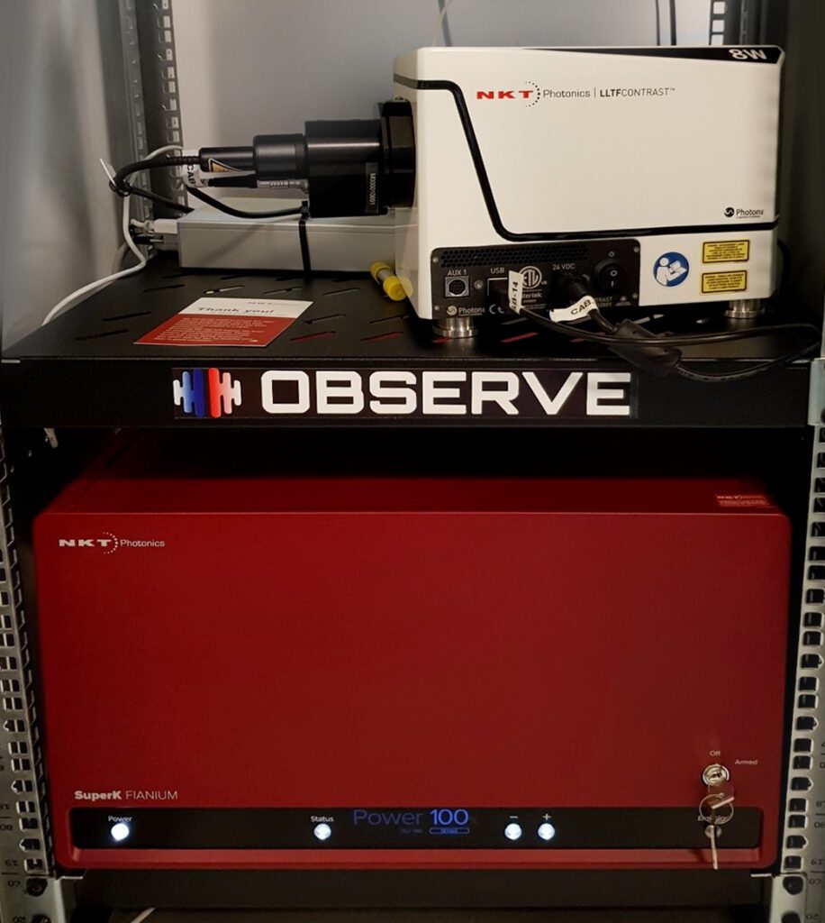 The OBSERVE bench is equipped with a SuperK FIANIUM supercontinuum white light laser coupled with an LLTF Contrast tunable bandpass filter from NKT Photonics, to provide highly monochromatic light across a broad spectral range (<0.4 nm FHWM over the 510-950 nm range).